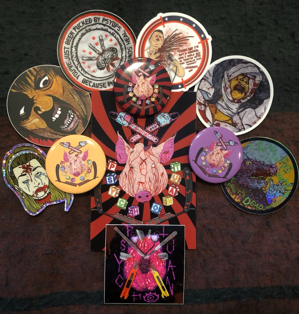 7 stickers, (including 1 glitter sticker and 1 holographic), 3 buttons, and 1 signed art print. All for one deeply discounted bulk price. While supplies last.